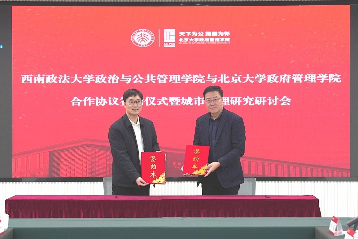 10月29日,西南政法大學(xué)科研處處長(zhǎng)張震,政治與公共管理學(xué)院黨委書記代莉平、院長(zhǎng)曾向紅一行訪問(wèn)北京大學(xué)政府管理學(xué)院。北大政府管理學(xué)院院長(zhǎng)燕繼榮、黨委書記李楊會(huì)見(jiàn)西南政法大學(xué)代表團(tuán)并在廖凱原樓召開(kāi)座談會(huì),雙方簽署合作協(xié)議。西南政法大學(xué)政治與公共管理學(xué)院副院長(zhǎng)、重慶城市治理與發(fā)展研究院執(zhí)行院長(zhǎng)類延村,副教授王山,教師李修科、劉元賀,北京大學(xué)社會(huì)科學(xué)部副部長(zhǎng)郭琳,北大政府管理學(xué)院副院長(zhǎng)、教務(wù)部副部長(zhǎng)黃璜,長(zhǎng)聘副教授孫鐵山、劉倫,助理教授羅薇參加座談會(huì)。座談會(huì)由李楊主持。